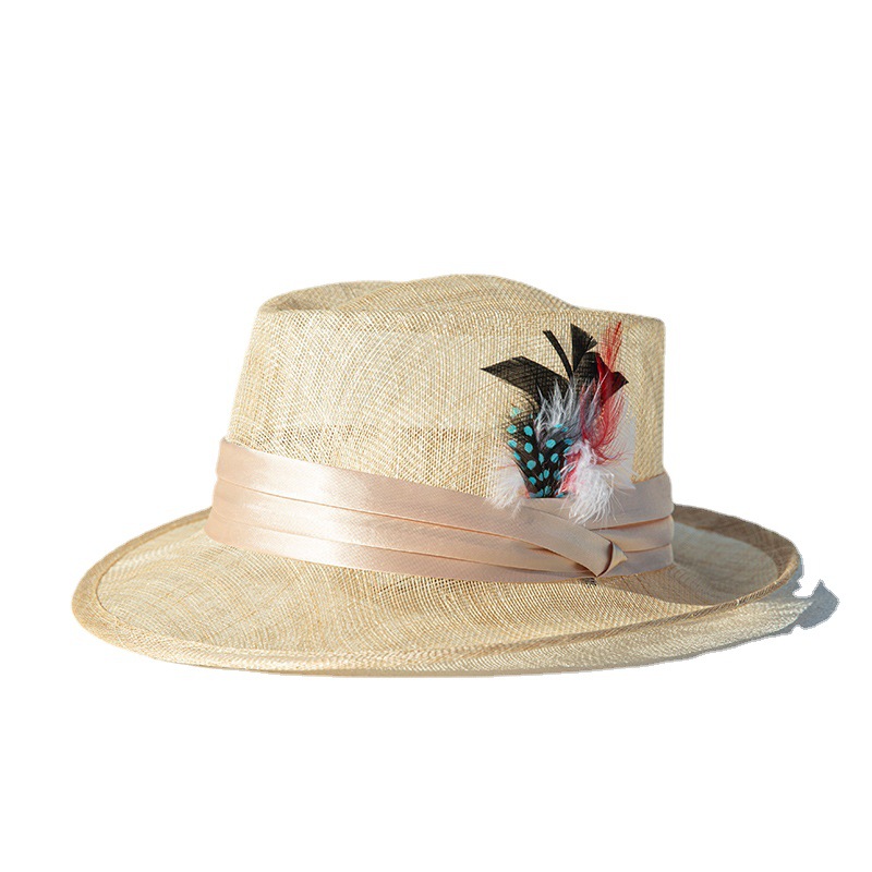 春夏新款麻紗帽透氣英倫風(fēng)爵士帽羽毛裝飾純色復(fù)古