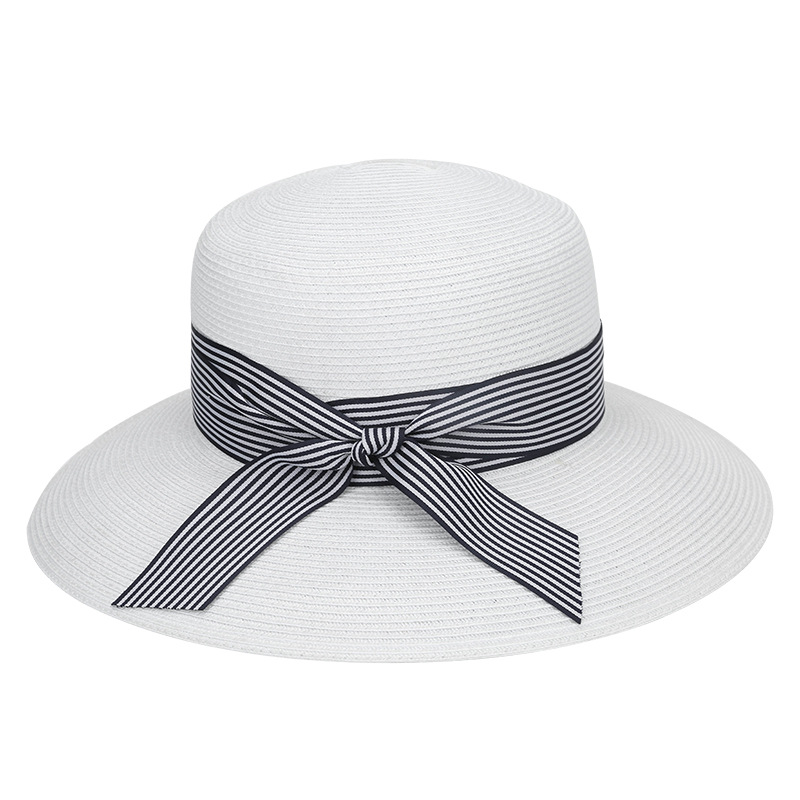 靈瓏服飾美式條紋蝴蝶結(jié)大帽檐圓頂禮帽 女夏天時(shí)尚太陽帽沙灘帽