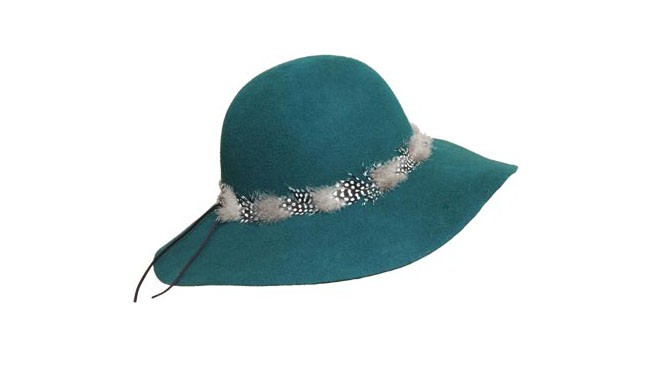 100%純羊毛的帽子,厚實的大檐羊毛帽,帽身圍繞一圈黑白相間的羽毛,別致而時尚。